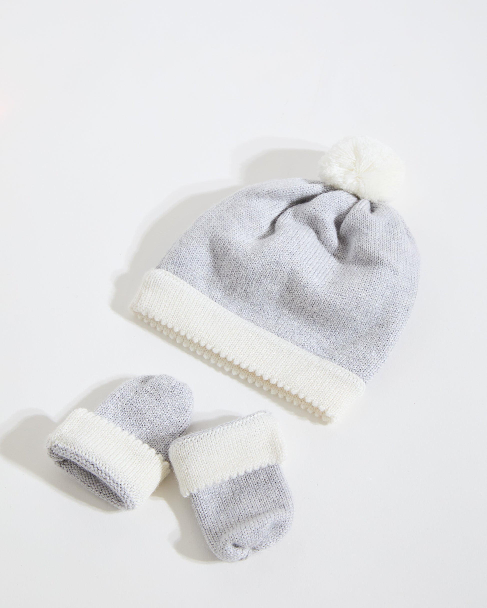 The hat features a beautifully soft white pom pom and our signature picot edge trim, with matching mittens finished with gentle Merino cuffs that stay comfortably in place without being tight on tiny wrists.